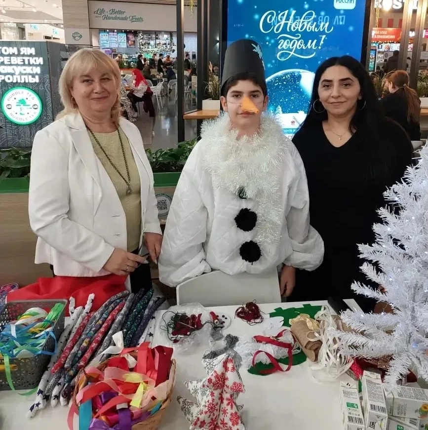 Алёна Викторовна совместно с помощниками, учеником 6 «А» класса Марком Кузикян и его семьей, и другими учениками Гимназии украшали ель под названием «Профи-елка». Участники изготавливали новогодние текстильные ёлочные игрушки и Рождественские веночки из ткани.