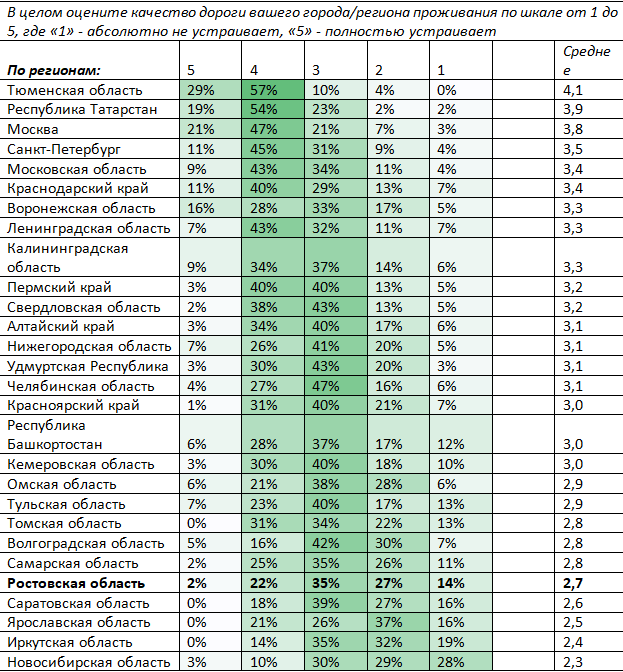Если говорить о России в целом, то больше всего дорогами в своем регионе довольны жители Тюменской области – они поставили 4,1 балла. На втором месте – Республика Татарстан (3,9 балла), на третьем – Москва (3,8). В целом удовлетворены качеством дорог жители Санкт-Петербурга (3,5), Московской области (3,4) и Краснодарского края (3,4). Худшие дороги, по мнению участников опроса, в Новосибирской (2,3), Иркутской (2,4) и Ярославской (2,5) областях.