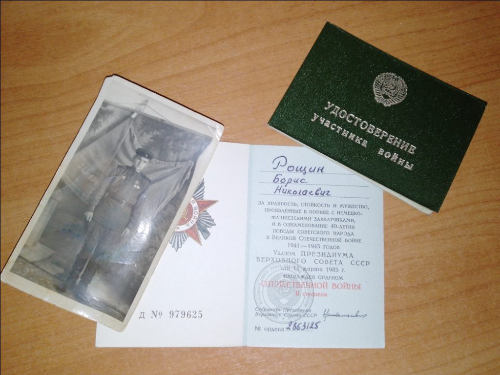 У моего героического прадедушки было очень много медалей и наград, но, к большому сожалению, мы не смогли сохранить все. Лишь из семейных рассказов, я знаю, что он писал в письмах, о том, что воюет за своих близких, за свою страну, что обязательно вернется с Победой. Часть наград мой папа сохранил, так что это единственная память, которая осталась ему от дедушки. Также Борис Николаевич был награжден орденом «За отвагу». За храбрость, стойкость и мужество, проявленные в борьбе с немецко-фашистскими захватчиками, указом Президиума Верховного Совета СССР, он был награждён орденом Великой Отечественной Войны II степени, орденом Славы III степени. После окончания Великой Отечественной Войны, Борис Николаевич Рощин был награжден медалью «За победу над Германией». При уходе на пенсию его наградили медалями «Ветеран труда» и «За доблестный труд».