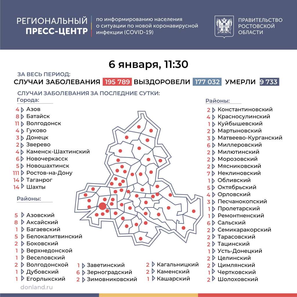 Новые инфицированные зарегистрированы в 53 городах и районах региона: в Ростове-на-Дону (111), Таганроге (14), Шахтах (14), Волгодонске (11), Батайске (8), Аксайском (8), Неклиновском (7) районах, Новочеркасске (6), Зерноградском (6), Миллеровском (6), Сальском (6) районах, Новошахтинске (5), Азовском (5), Белокалитвинском (5), Октябрьском (5) районах, Азове (4), Гуково (4), Каменске-Шахтинском (4), Красносулинском (4), Орловском (4) районах, Донецке (3), , Матвеево-Курганском (3), Песчанокопском (3) районах, Зверево (2), Боковском (2), Волгодонском (2), Зимовниковском (2), Кагальницком (2), Каменском (2), Константиновском (2), Мартыновском (2), Милютинском (2), Морозовском (2), Мясниковском (2), Семикаракорском (2), Тарасовском (2),Тацинском (2), Целинском (2), Цимлянском (2), Шолоховском (2), Багаевском (1), Верхнедонском (1), Веселовском (1), Дубовском (1), Егорлыкском (1), Заветинском (1), Кашарском (1), Куйбышевском (1), Обливском (1), Пролетарском (1), Ремонтненском (1), Усть-Донецком (1), Чертковском (1) районах.