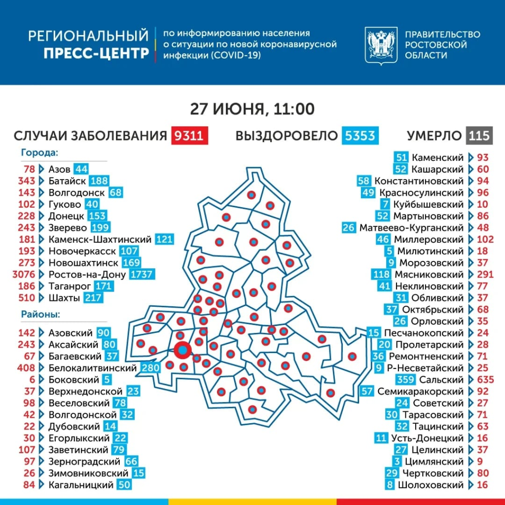 Новые инфицированные зарегистрированы в 20 городах и районах области: в Ростове-на-Дону (69), Шахтах (8), Новочеркасске (4), Белокалитвинском (4), Азовском (3), Аксайском (3) районах, Батайске (3), Октябрьском (3), Багаевском (2), Цимлянском (2) районах, Новошахтинске (2), Донецке (2), Азове (2), Таганроге (2), Мясниковском (2), Красносулинском (1) районах, Каменске-Шахтинском (1), Каменском (1), Неклиновском (1) районах и Звереве (1).