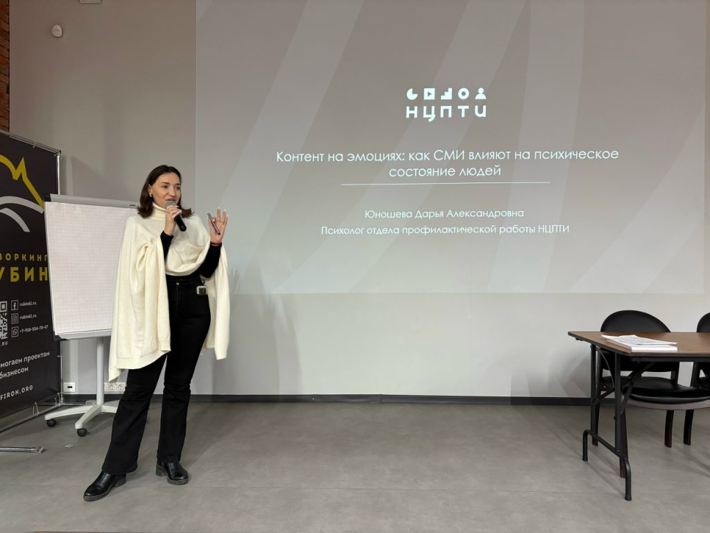 О роли СМИ в профилактике распространения угроз на конкретных примерах и о том, чего стоит придерживаться в работе журналисту, рассказал начальник отдела аналитики НЦПТИ Сергей Венцель. Психолог отдела профилактики НЦПТИ Дарья Юношева озвучила аспекты психологического влияния новостей на массы в современную эпоху.