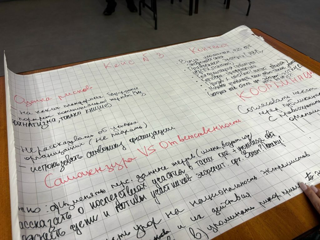 После докладов журналисты и студенты закрепили знания на практике, решая тематические кейсы. К примеру, нашей команде предстояло найти правильный подход к написанию журналистского расследования о методах вербовки молодежи в запрещенную в РФ экстремистскую организацию: указать, как и чем сопроводить публикацию для профилактического эффекта, помочь силовикам и обществу распознать угрозу.