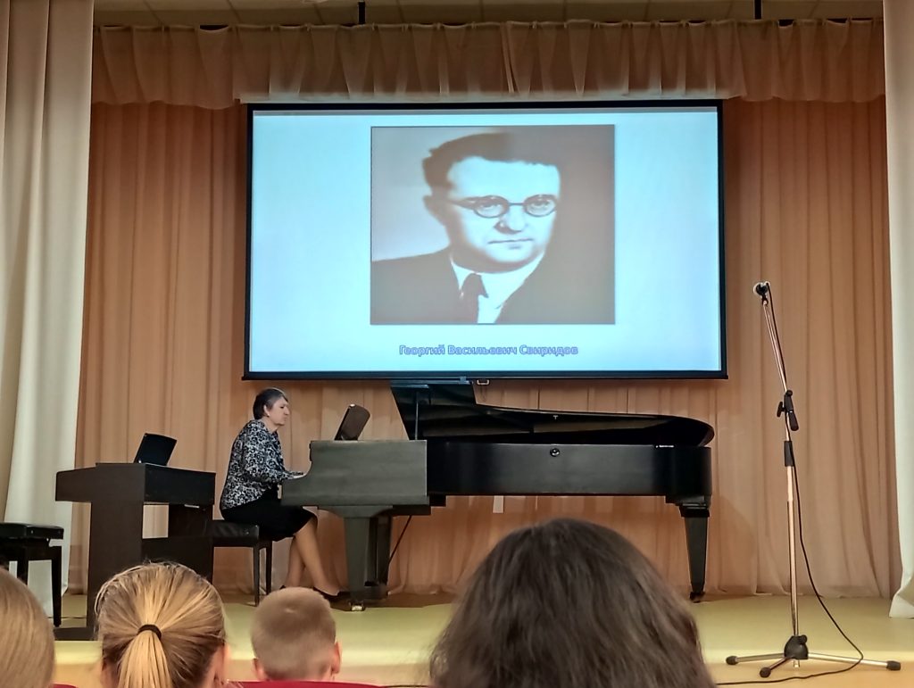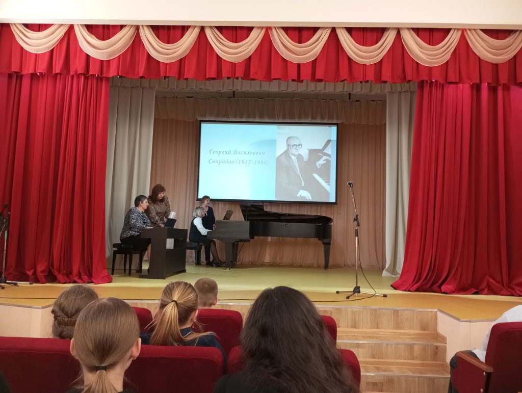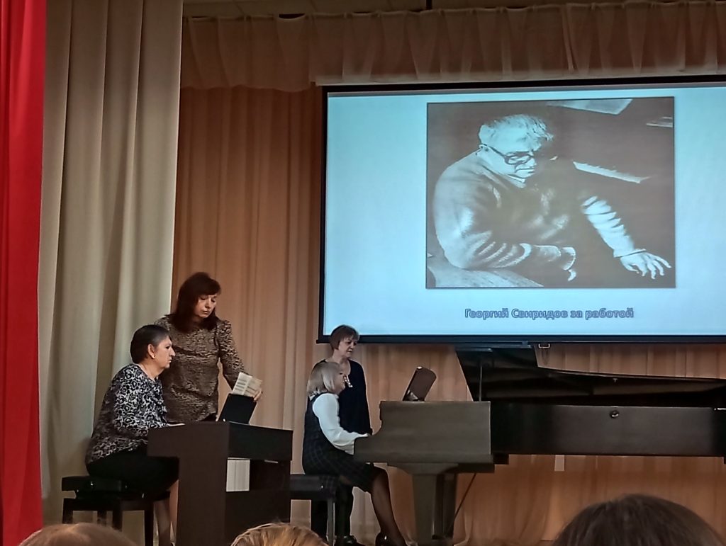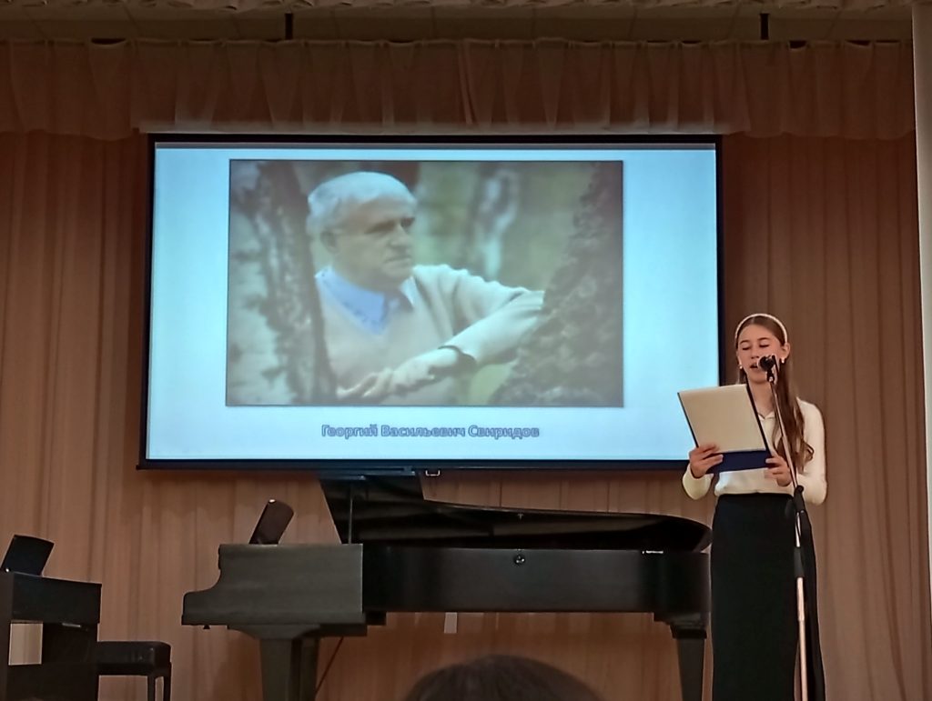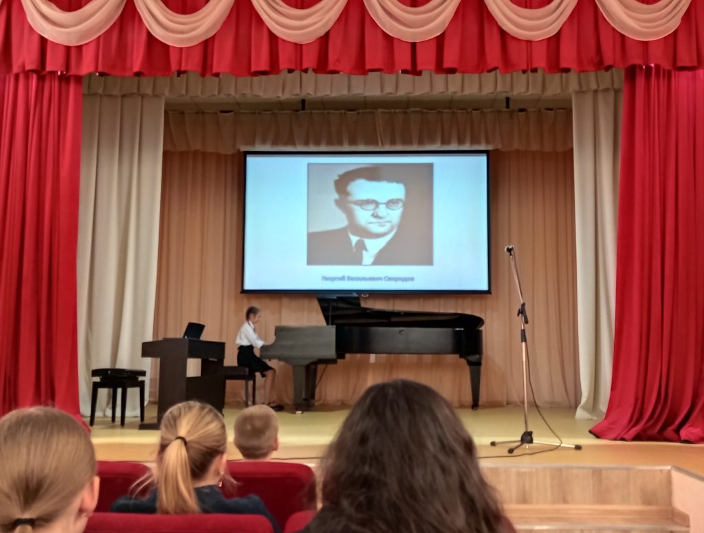 Концерт-лекторий «Гордость и душа России — Георгий Свиридов» был подготовлен преподавателями теоретического отдела Ириной Владимировной Горбенко и Татьяной Ивановной Недогуба. В роли ведущей выступила Милана Лапченкова (преподаватель И.В. Горбенко), учащаяся 6 класса фортепиано, которая интересно и эмоционально представила презентацию и рассказ о величайшем гении, народном артисте, лауреате государственных премий, кавалере орденов, человеке, сумевшем продолжить великую русскую музыкальную традицию. Из ее выступления учащиеся узнали много интересных фактов о жизни композитора, его пути к искусству и влиянии его музыки на современников.