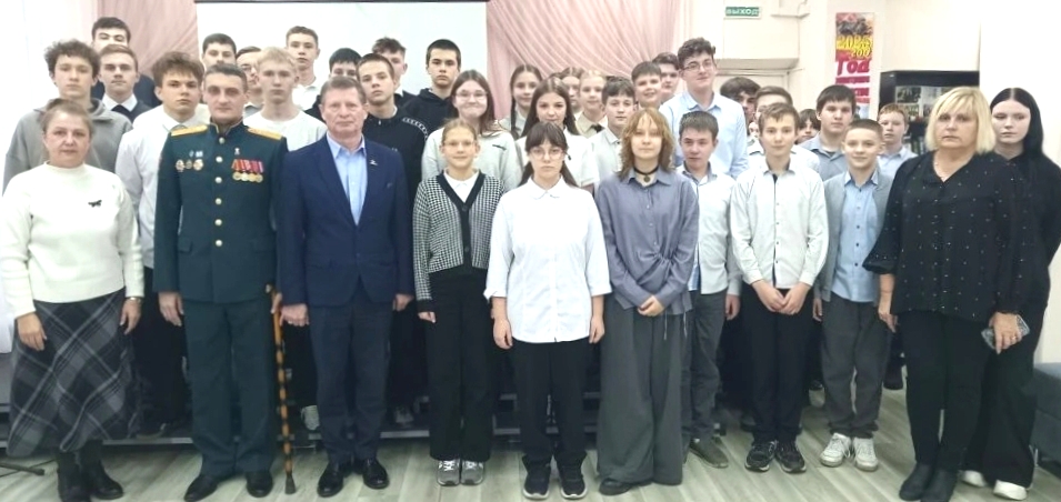 Участниками патриотического часа стали старшеклассники школы №15. В качестве почётных гостей были приглашены участник СВО Василий Сироткин и депутат Гуковской городской думы, ветеран вооружённых сил РФ и труда Валерий Беня.