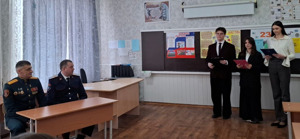 Нашими гостями стали люди, для которых слова «честь», «долг» и «Родина» – не пустые звуки, а жизненный путь. Это действующий военнослужащий пятидесятой отдельной бригады оперативного назначения, ветеран СВО старший прапорщик Василий Николаевич Сироткин и представитель городского казачьего общества муниципального образования «Город Гуково» Андрей Геннадьевич Капитан. Беседуя со школьниками, гости отметили, что Россия испокон веков славилась своими защитниками, которые без колебаний вставали на стражу интересов и защиты страны. И оставаться в стороне, когда началась спецоперация Василий Николаевич не смог. Василий Николаевич рассказал, почему принял решение служить Родине и какие испытания ему пришлось преодолеть. Рассказ вызвал у учеников большой интерес. Ребята задали гостям много вопросов. Многие в этот день впервые увидели войну не на экране, а глазами того, кто сам прошел через это, и этот взгляд, несомненно, запомнится надолго.