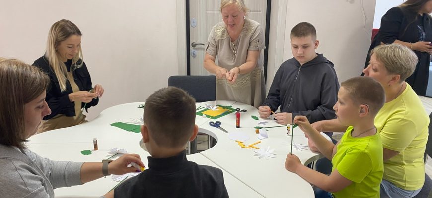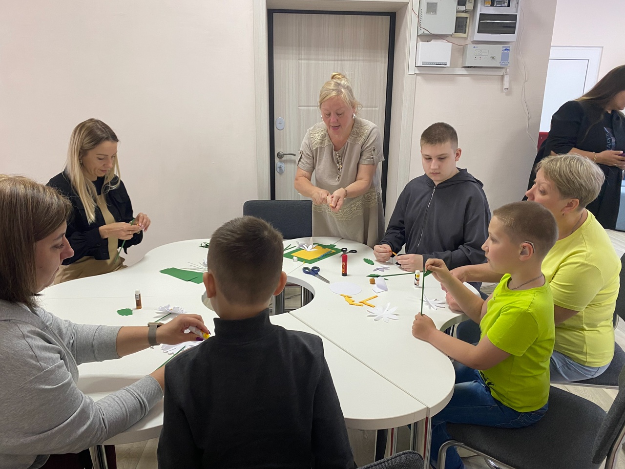 Затем волонтер культуры города Гуково М.В. Кром предложила ребятам и родителям заняться творчеством и сделать ромашки из бумаги на мастер-классе «Ромашка семейного счастья». Взрослые и дети с энтузиазмом и старанием принялись за дело, и вот уже веселая, жизнерадостная ромашка, выполненная из бумаги методом аппликации, радует глаза ребят.