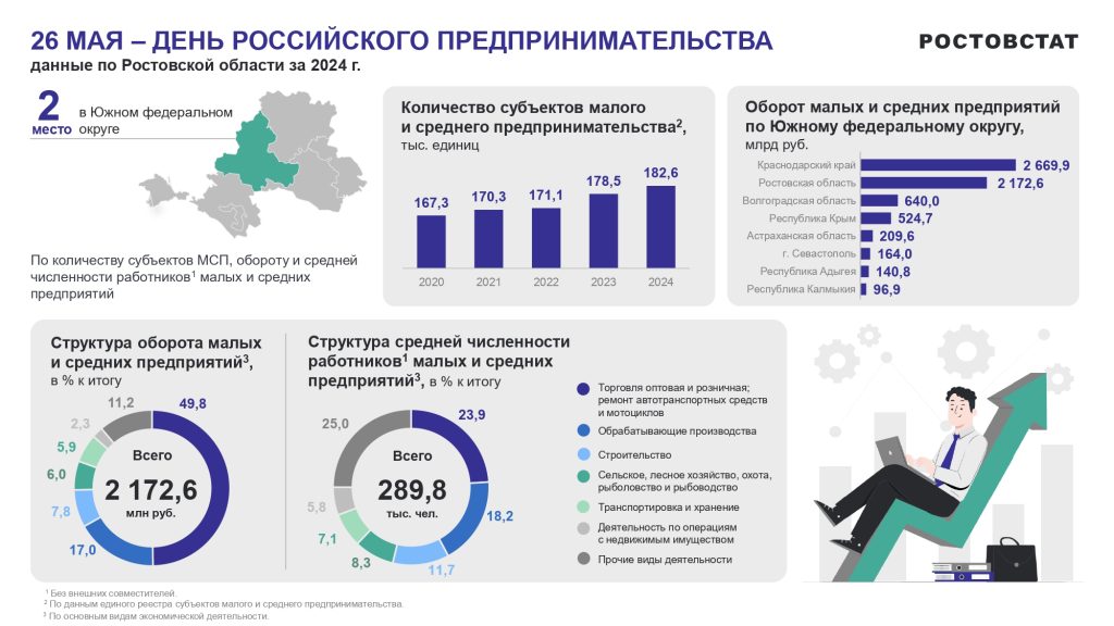 На начало 2025 года в Ростовской области насчитывалось 43,4 тыс. малых и средних предприятий и 139,2 тыс. индивидуальных предпринимателей. В рэнкинге регионов России по числу субъектов малого и среднего предпринимательства наш регион занимает 6 место после Москвы, Московской области, Санкт-Петербурга, Краснодарского края и Свердловской области.