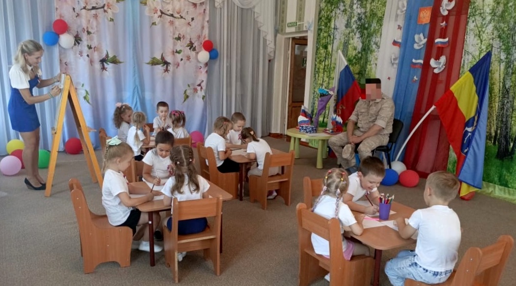Маленькие художники внимательно слушали рассказ нашего гостя и с большой любовью и вниманием изображали портрет Героя, вкладывая в каждую работу свою благодарность.