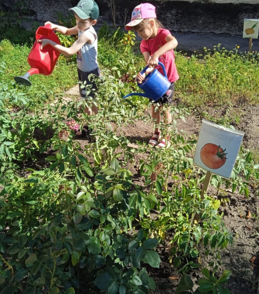 Юные огородники не забыли и про свои грядки- полили растения, убрали сорняки. Была проведена беседа о пользе овощей.