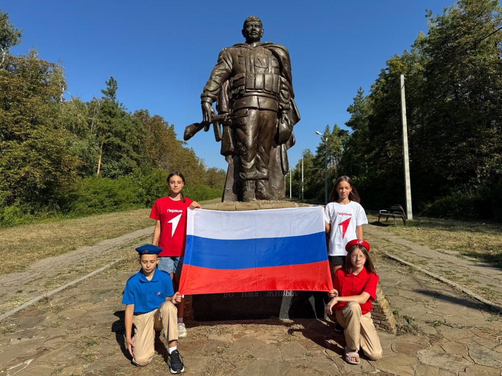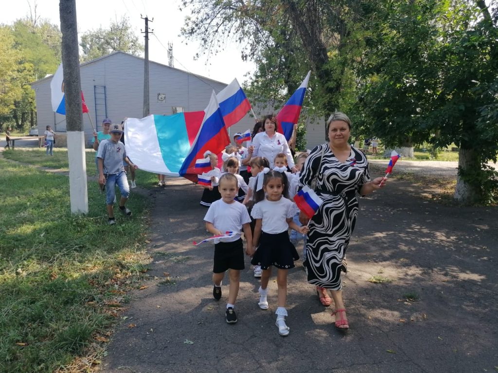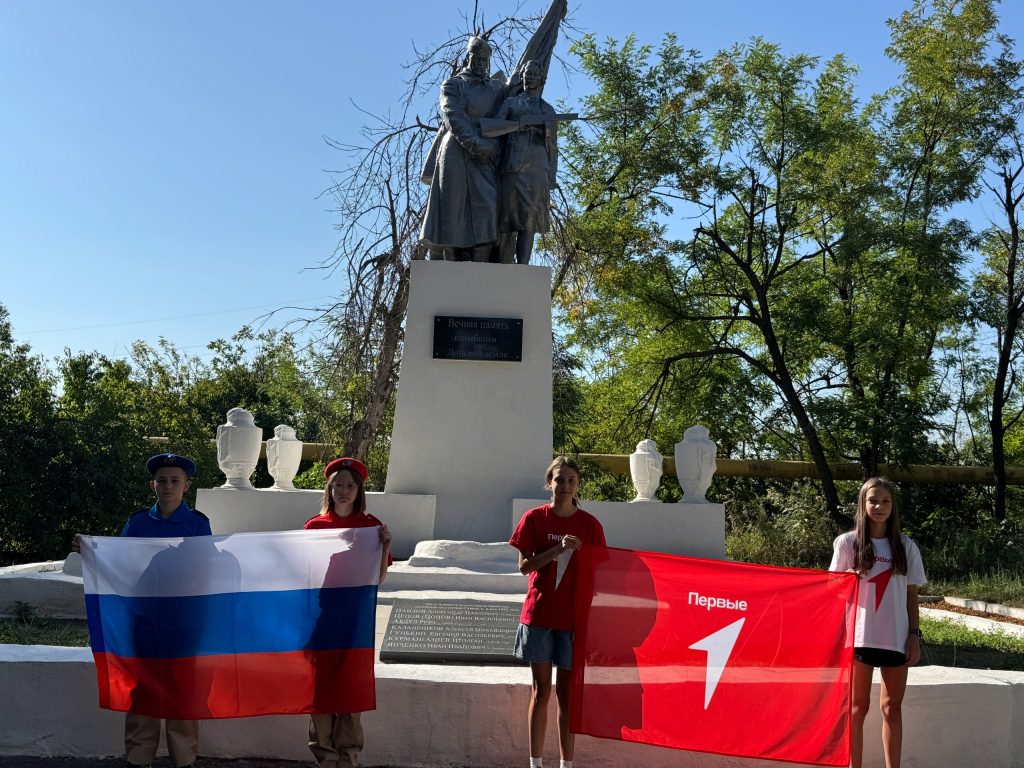 Участники акции торжественным шествием пронесли российские флаги по главной улице микрорайона пос. ш. «Октябрьская» и к Братской могиле воинов Красной Армии, как дань гордости, уважения и памяти к подвигам и славе русского народа.