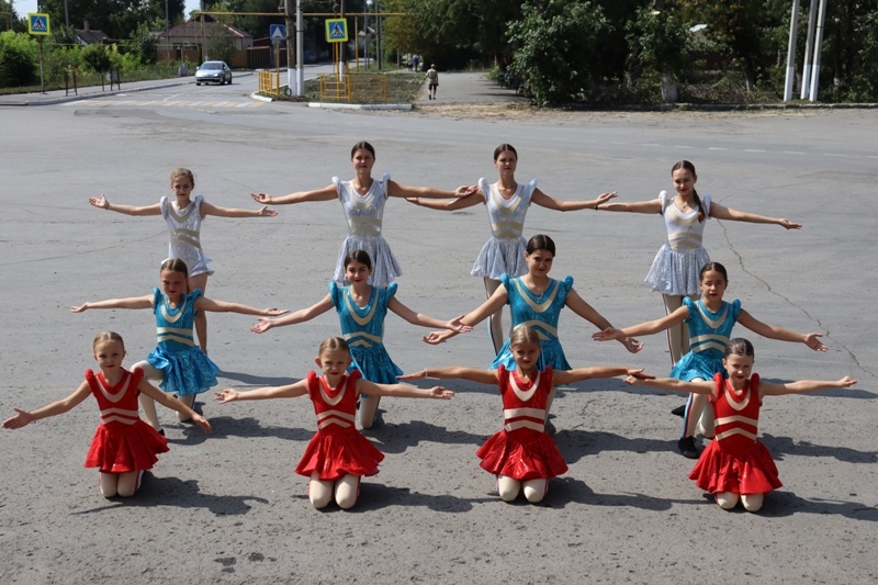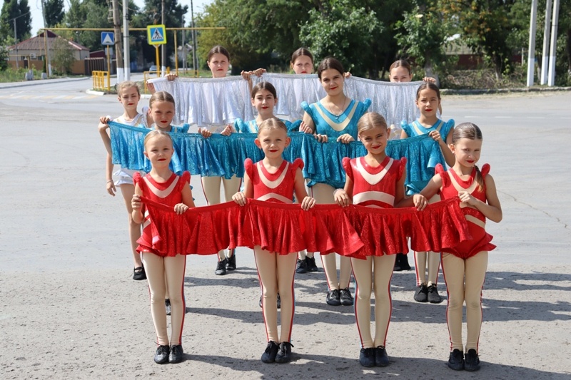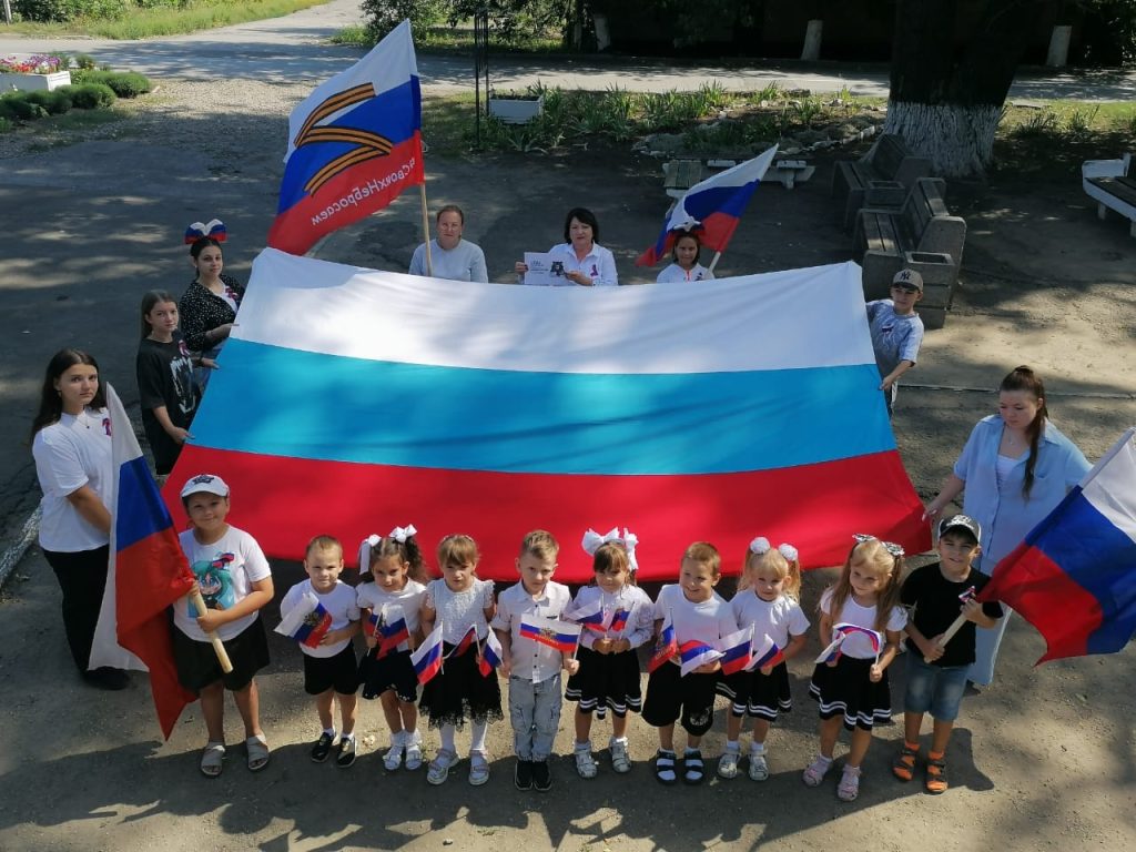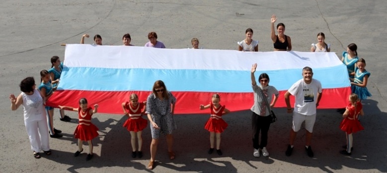 Волонтеры культуры, участники кружков и любительских объединений клуба, воспитанники и педагоги детского сада «Гвоздика» растянули на площади клуба «Октябрьский» полотно с Триколором Российской Федерации.