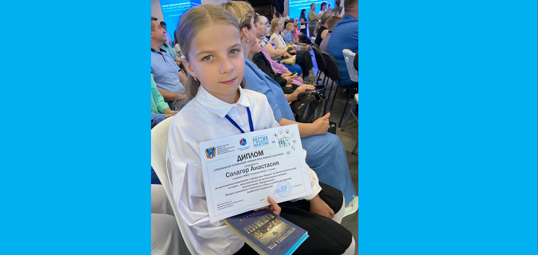 Ученице Гимназии №10 Анастасии Салагор был вручен Диплом победителя в специальной номинации «Самый креативный сценарий» за выполненный видеоролик о профессии «Педагог по физической культуре и спорту», представленный на региональном конкурсе видеороликов «Профминутка» и Сертификат на посещение выставки.