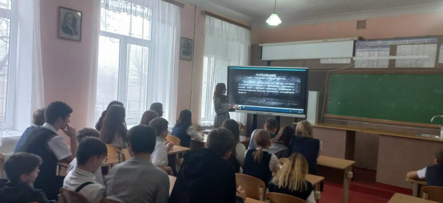 В рамках беседы обучающимся был продемонстрирован видеофильм о наркотиках, их видах, последствиях употребления, методах вовлечения в употребление наркотических веществ. Инспектор ПДН Отдела МВД России по городу Гуково рассказала ребятам об административной и уголовной ответственности за употребление и распространение ПАВ. Просмотрев познавательный видеоролик, ребята смогли наглядно убедиться в колоссальном вреде, который люди наносят своему здоровью из-за пагубных привычек. По итогам мероприятия учащиеся школы смогли получить ответы на интересующие их вопросы.