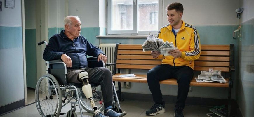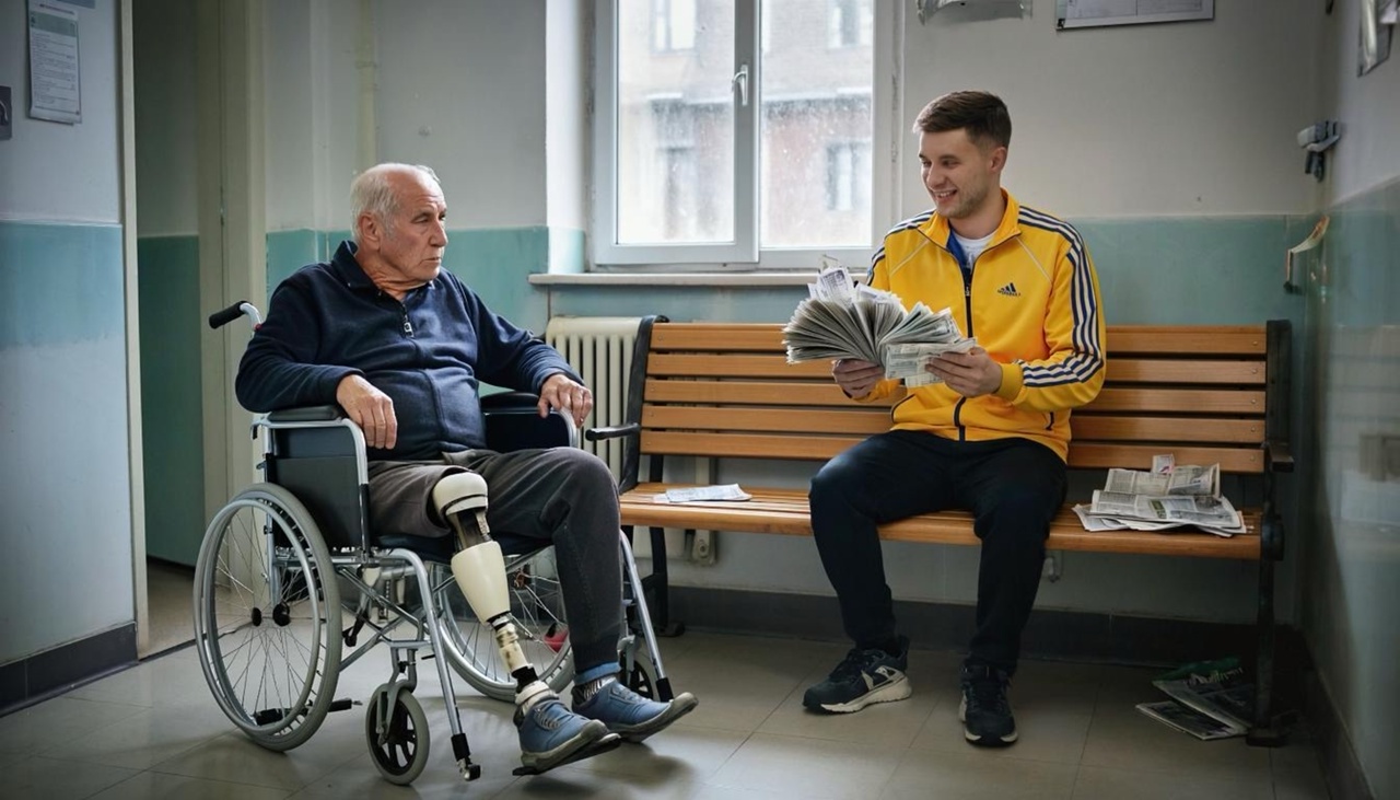 У кабинета сидел старичок в инвалидной коляске. Он нервно поглядывал на часы, ожидая, когда же его примут. Через время на скамейку, что стояла рядом, присел парень. Стильная прическа, модная одежда и телефон последней модели выдавали его хорошее финансовое положение.