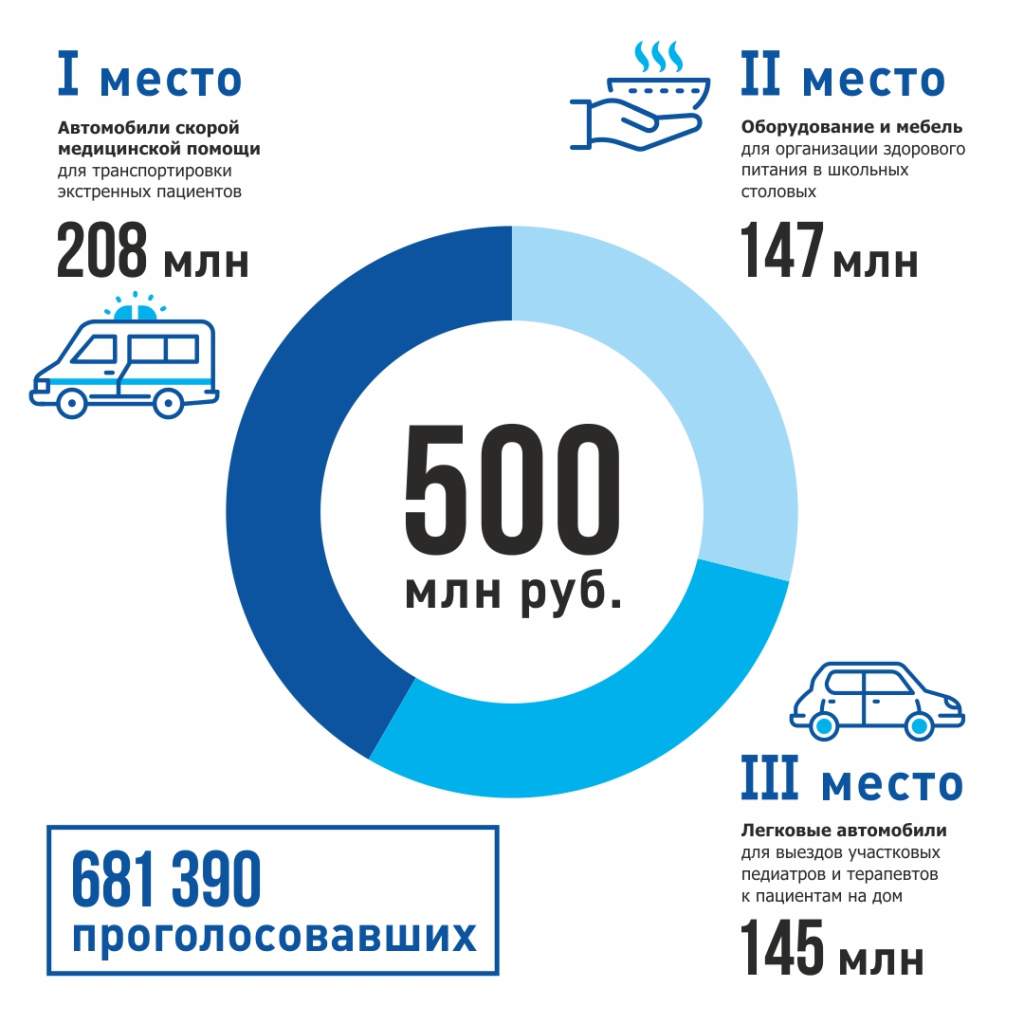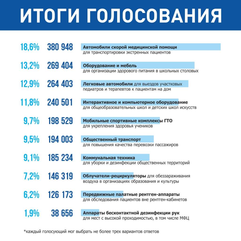 Больше всего людей проголосовало за приобретение автомобилей скорой помощи. На втором месте – оборудование и мебель для школьных столовых, на третьем – машины для участковых врачей.