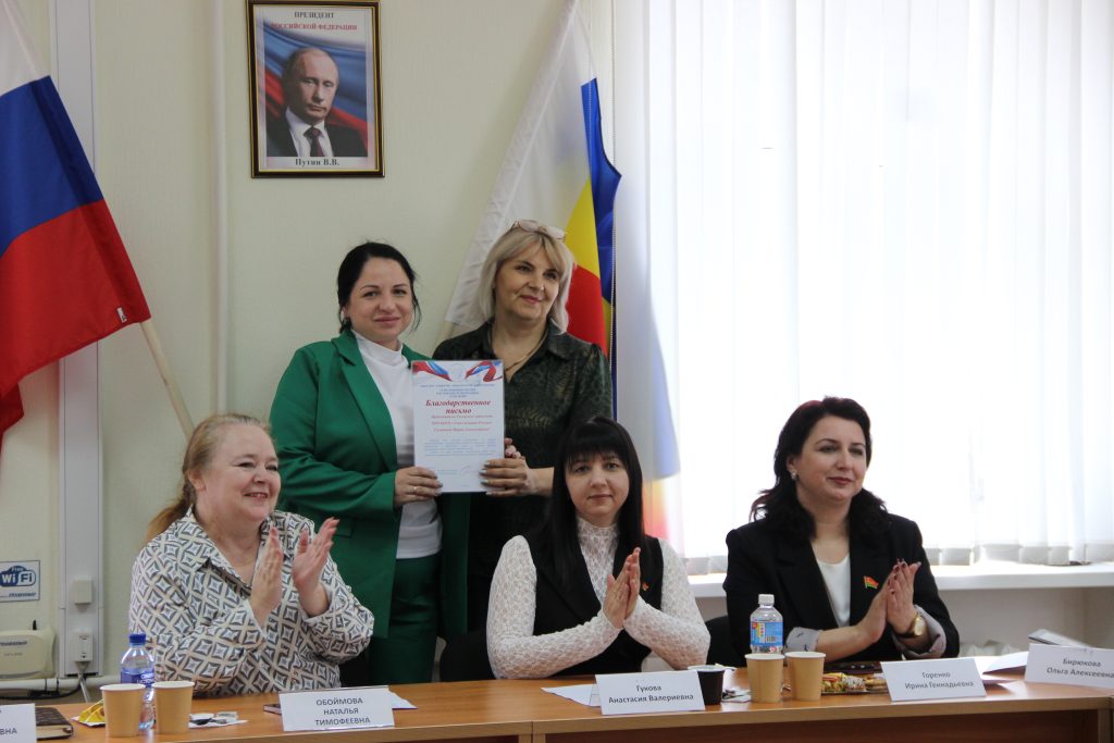 Председатель Донецкого отделения «Союза женщин России» Ольга Бирюкова вручила Марии Головиной Благодарственное письмо за развитие межмуниципального сотрудничества, активную гражданскую позицию, неравнодушие и действенное участие в развитии женского предпринимательства и женского движения в целом.