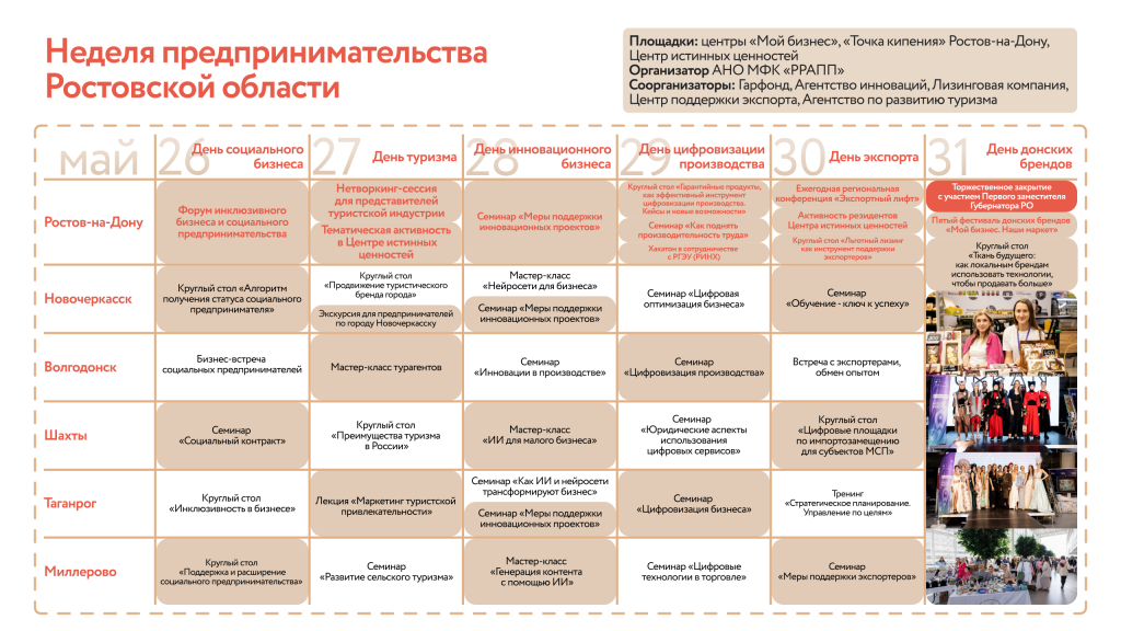 27 мая, в День туризма, запланирована нетворкинг-сессия для представителей туриндустрии. А 28 мая пройдет под эгидой Дня инновационного бизнеса. В крупнейших городах области состоятся семинары по мерам поддержки инновационных технологических проектов от АНО «Агентство инноваций Ростовской области».