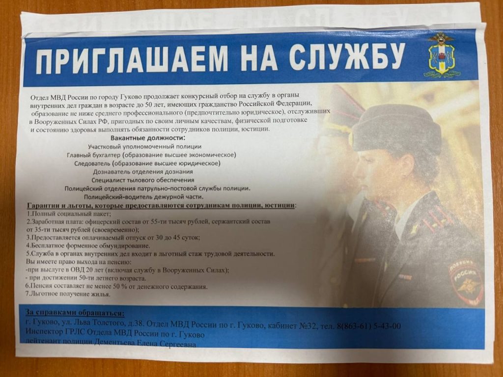В ходе проведённой беседы сотрудником полиции было подробно рассказано о порядке приёма на службу в органы внутренних дел, о размере заработной платы, о льготах и преимуществах, которые предоставляет прохождение службы.