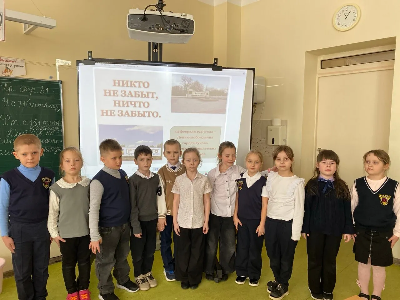 Школьникам была представлена презентация «В служении верном Отчизне клянусь», из которой ребята узнали о том, каким страшным испытанием для людей были дни оккупации, об ожесточенных боях, проходивших в феврале 1943 года на гуковской земле, о героях, чьими именами названы улицы нашего города, о памятниках, в которых увековечен подвиг русского солдата.