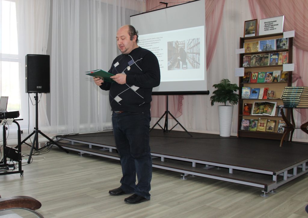 Преподаватель Гуковского строительного техникума, советник директора по воспитанию и взаимодействию с детскими общественными объединениями Эрнест Енгоян подготовил содержательную презентацию, поведав о роли и значении книг в нашей жизни и об их влиянии на А. Пушкина, Н. Гоголя, Л. Ландау, Д. Менделеева и других великих людей.