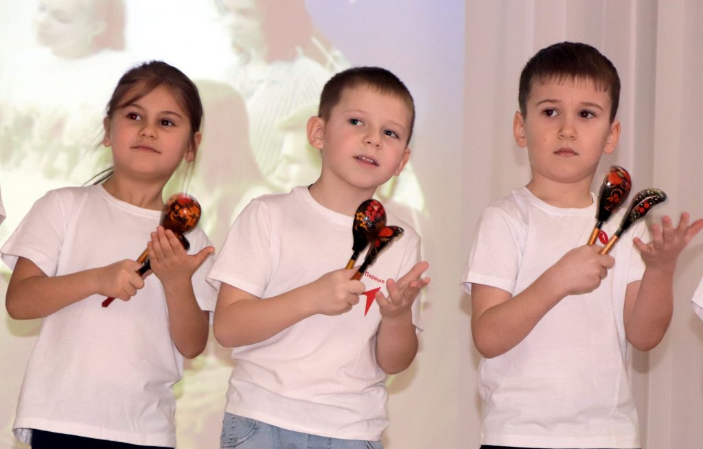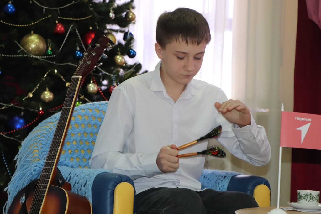 Юные Первые преподнесли всем присутствующим творческие подарки: своей игрой на ложках и колокольчиках заразили всех отличным настроением. Виртуозное владение ложками показал и сегодняшний гость, а также Дмитрий рассказал, что научил его этому педагог Дома детского творчества.