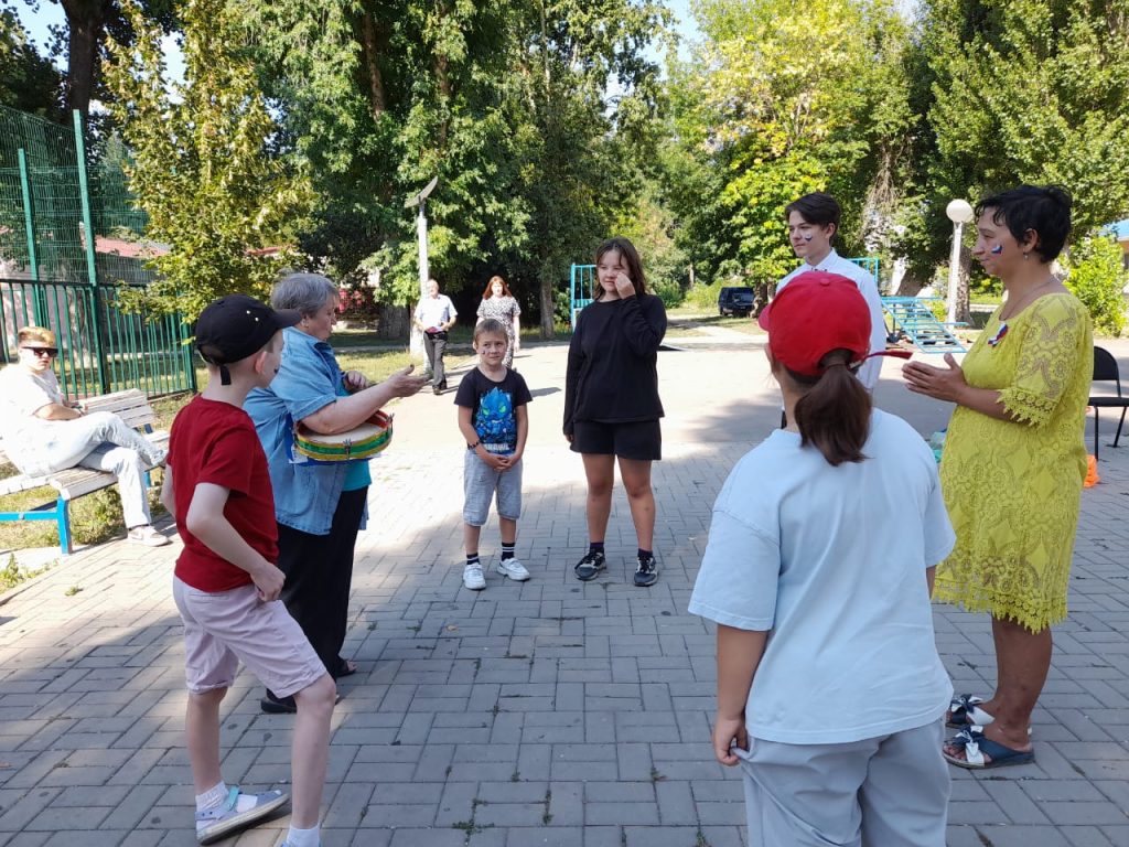 А на спортивной площадке за ГДК состоялась спортивно-игровая программа «Гордо реет надо мною триколор моей страны». Режиссер образцового детского театра «Улыбка» Валентина Алексеевна Николаева увлекательно рассказала ребятам об истории создания российского флага, о том, какое значение имеют его цвета – белый, синий и красный.