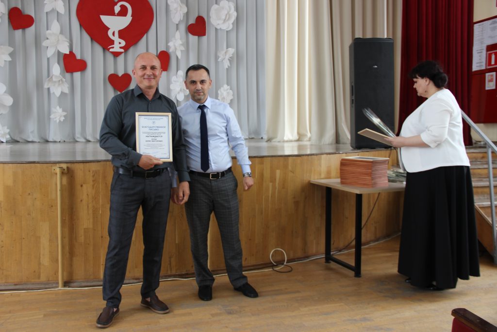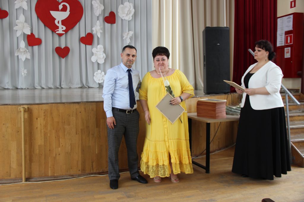 Он вручил Благодарственные письма Татьяне Ивановне Лужанской – медицинской сестре участковой поликлинического отделения № 2, Анне Залибековне Акобян – медицинской сестре процедурной травматологического отделения, Николаю Николаевичу Кузьмину – врачу-педиатру участковому поликлинического отделения № 3, Нэле Рамазановне Леоновой – санитарке хирургического отделения, Марине Вадимовне Новиковой – медицинской сестре дневного стационара, Лидии Ивановне Трифоновой – сестре-хозяйке отделения сестринского ухода, Людмиле Геннадьевне Шиколенко – фельдшеру-лаборанту клинико-диагностической лаборатории, Ирине Васильевне Кабак – медицинской сестре-анестезисту отделения анестезиологии-реанимации, Ольге Викторовне Семичаевской – медицинской сестре гинекологического отделения, Елене Васильевне Сотниковой – санитарке операционной хирургического отделения, Елене Николаевне Чернецкой – буфетчице административно-хозяйственной части подразделения № 6, Татьяне Сергеевне Забковой – фельдшеру скорой медицинской помощи, Светлане Владимировне Струговец – специалисту по кадрам аппарата управления, Екатерине Ивановне Свищевой – уборщику служебных помещений административно-хозяйственной части подразделения № 6, Михаилу Геннадьевичу Куликову – врачу акушеру-гинекологу женской консультации.
