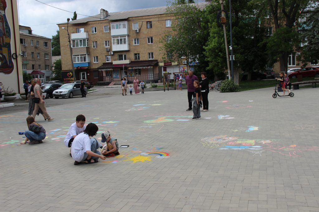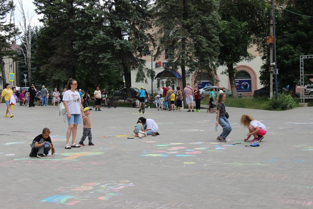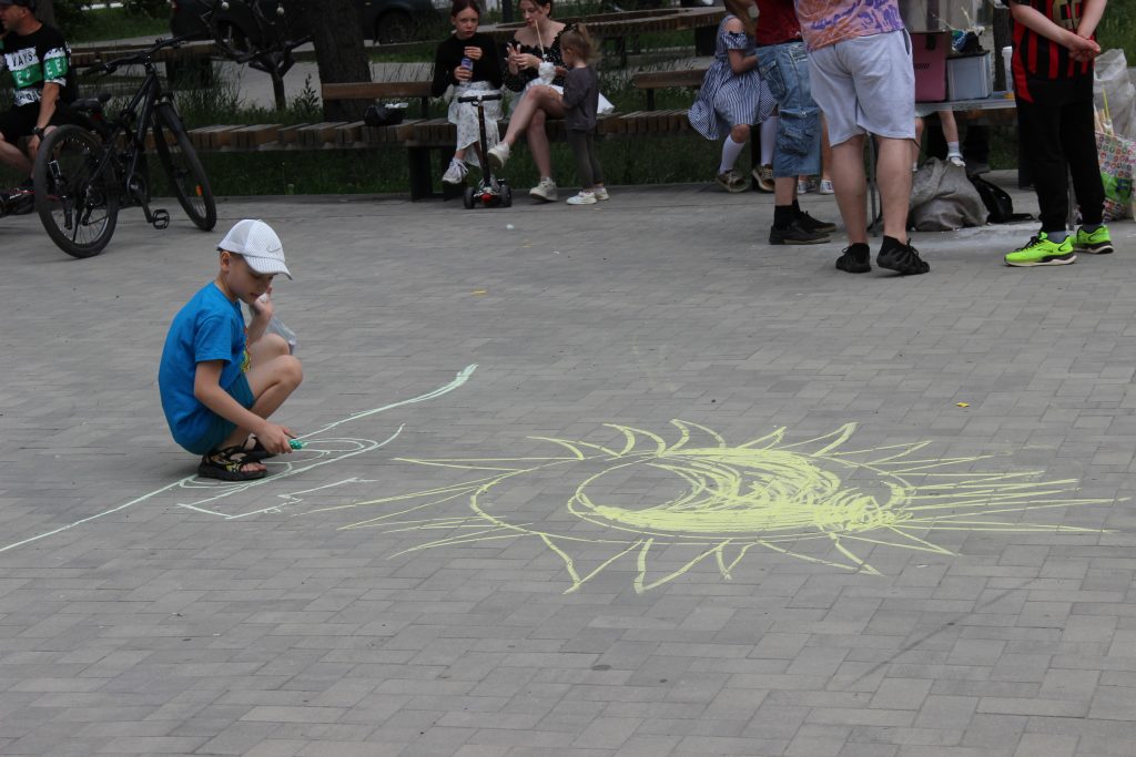 Юные художники раскрасили площадь перед ГДК яркими мелками — рисовали солнышко, радугу, домашних любимцев, словом, передавали свое настроение и мечты — весело и беззаботно провести летние каникулы.