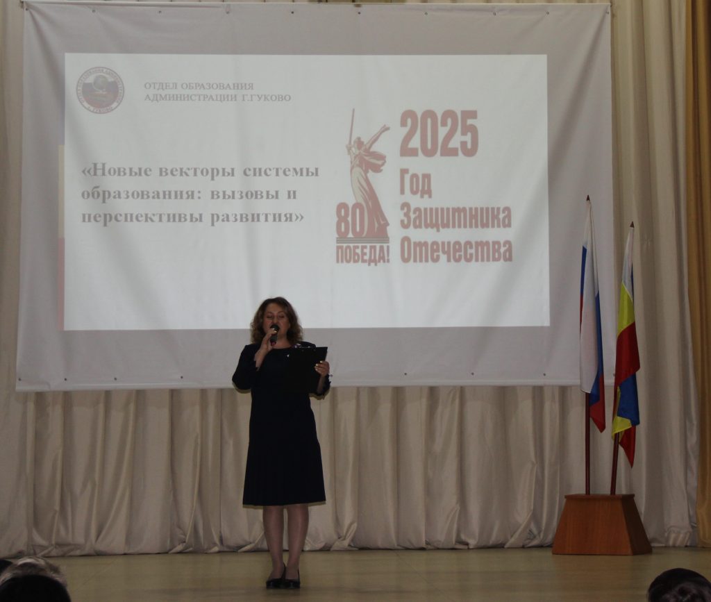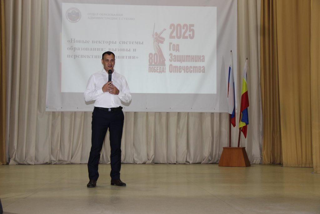 В зале собрались руководители и педагоги образовательных организаций города, представители Администрации, общественности, Юнармии, Движения Первых, профсоюзов, депутаты Гуковской городской Думы.