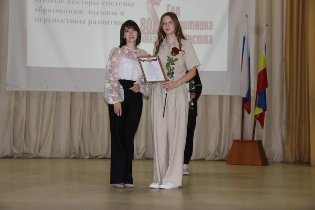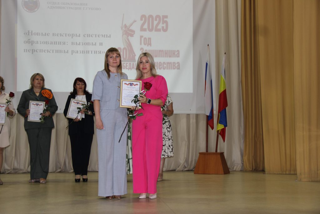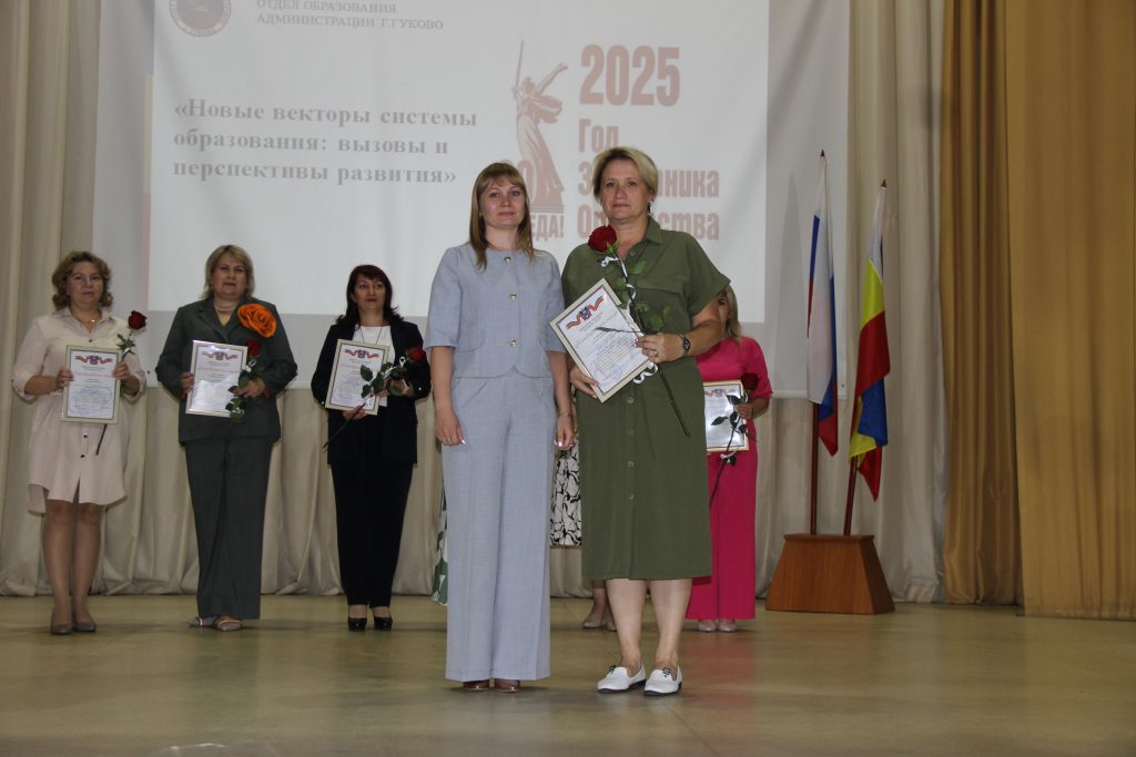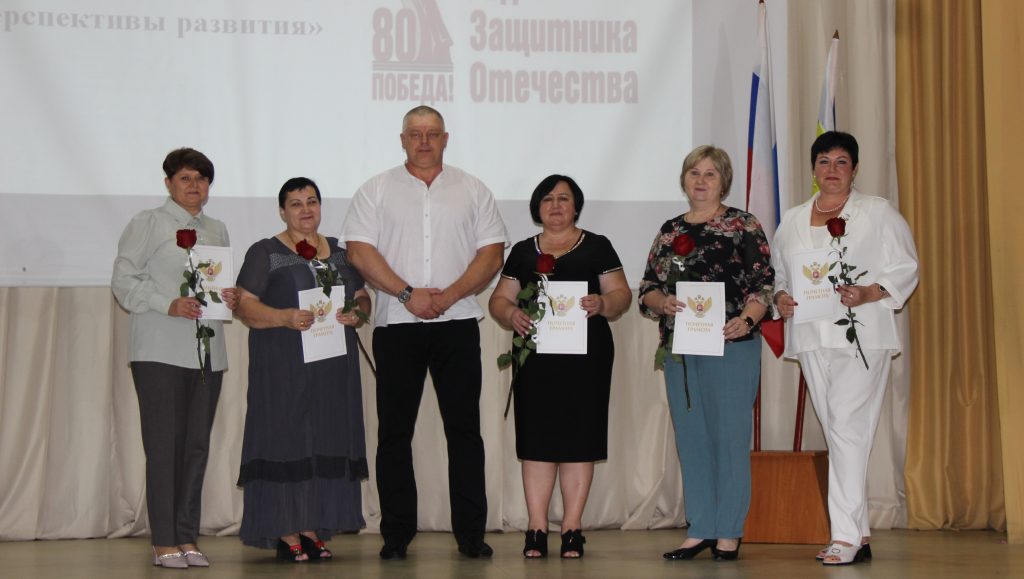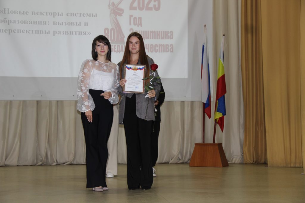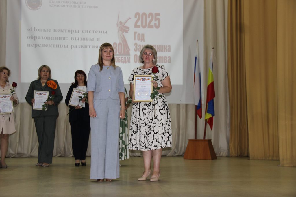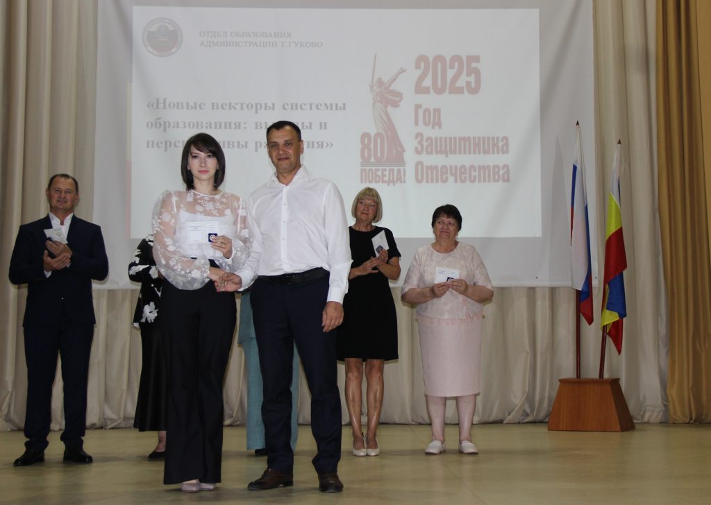Они поблагодарили работников образования за их труд и пожелали в новом учебном году здоровья, успехов, вдохновения и сил. Лучшие педагоги были отмечены наградами. Звание «Почетный работник сферы образования Российской Федерации» и нагрудный знак получили: А. Маньшин, М. Лебедева. Нагрудным знаком «За верность профессии» были награждены: О. Мандрыкина, Т. Деревянко. А. Площанская была удостоена нагрудного знака «Молодость и профессионализм».