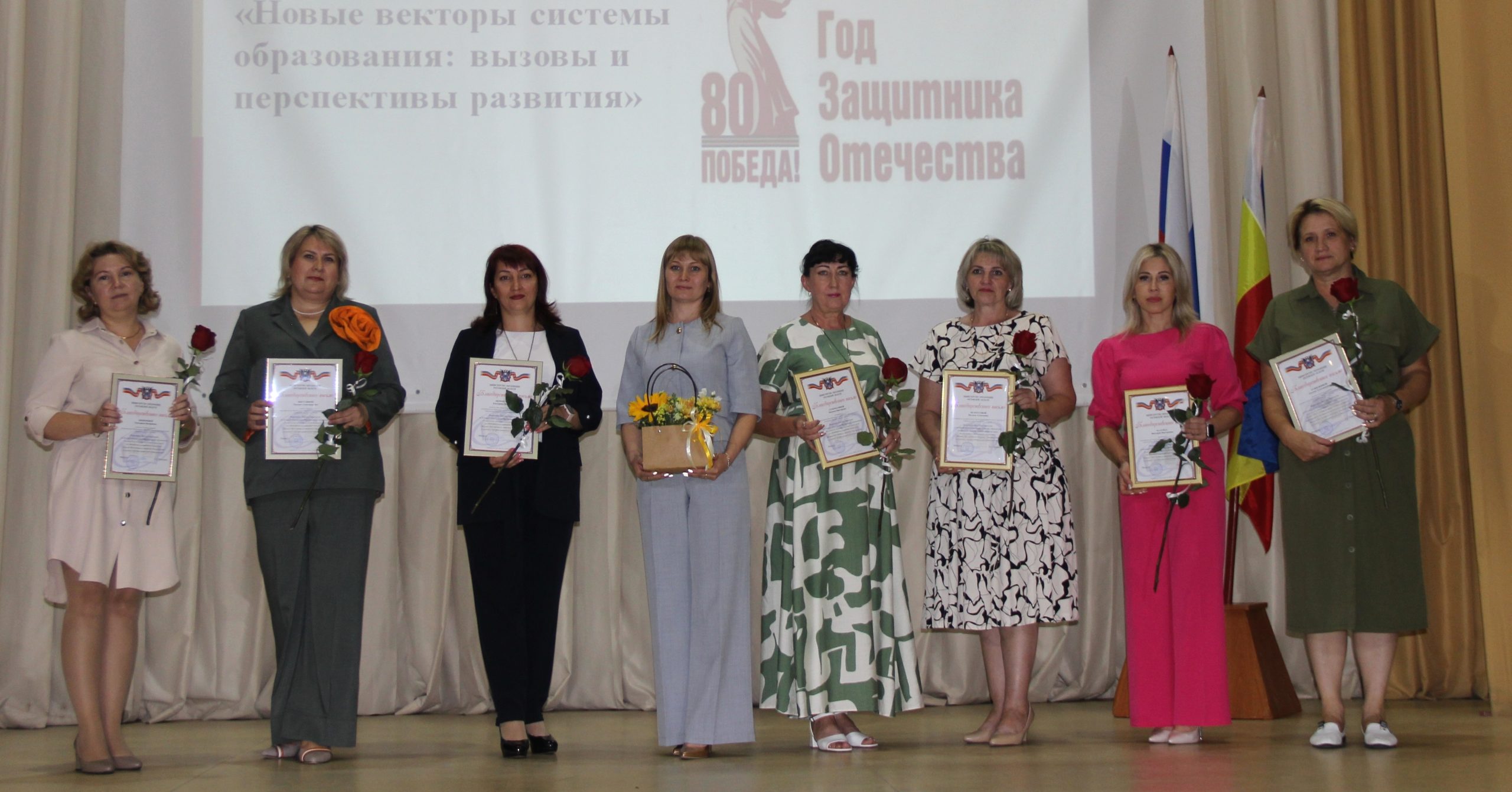 Они поблагодарили работников образования за их труд и пожелали в новом учебном году здоровья, успехов, вдохновения и сил. Лучшие педагоги были отмечены наградами. Звание «Почетный работник сферы образования Российской Федерации» и нагрудный знак получили: А. Маньшин, М. Лебедева. Нагрудным знаком «За верность профессии» были награждены: О. Мандрыкина, Т. Деревянко. А. Площанская была удостоена нагрудного знака «Молодость и профессионализм».