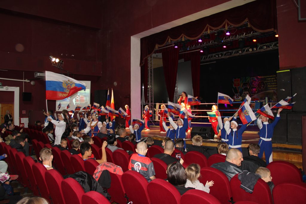 Торжественная часть закончилась выступлением Екатерины Галицыной, которая исполнила песню о России. Сделать номер красочным и грандиозным ей помогли участники образцового хореографического ансамбля «Ритмы юности».