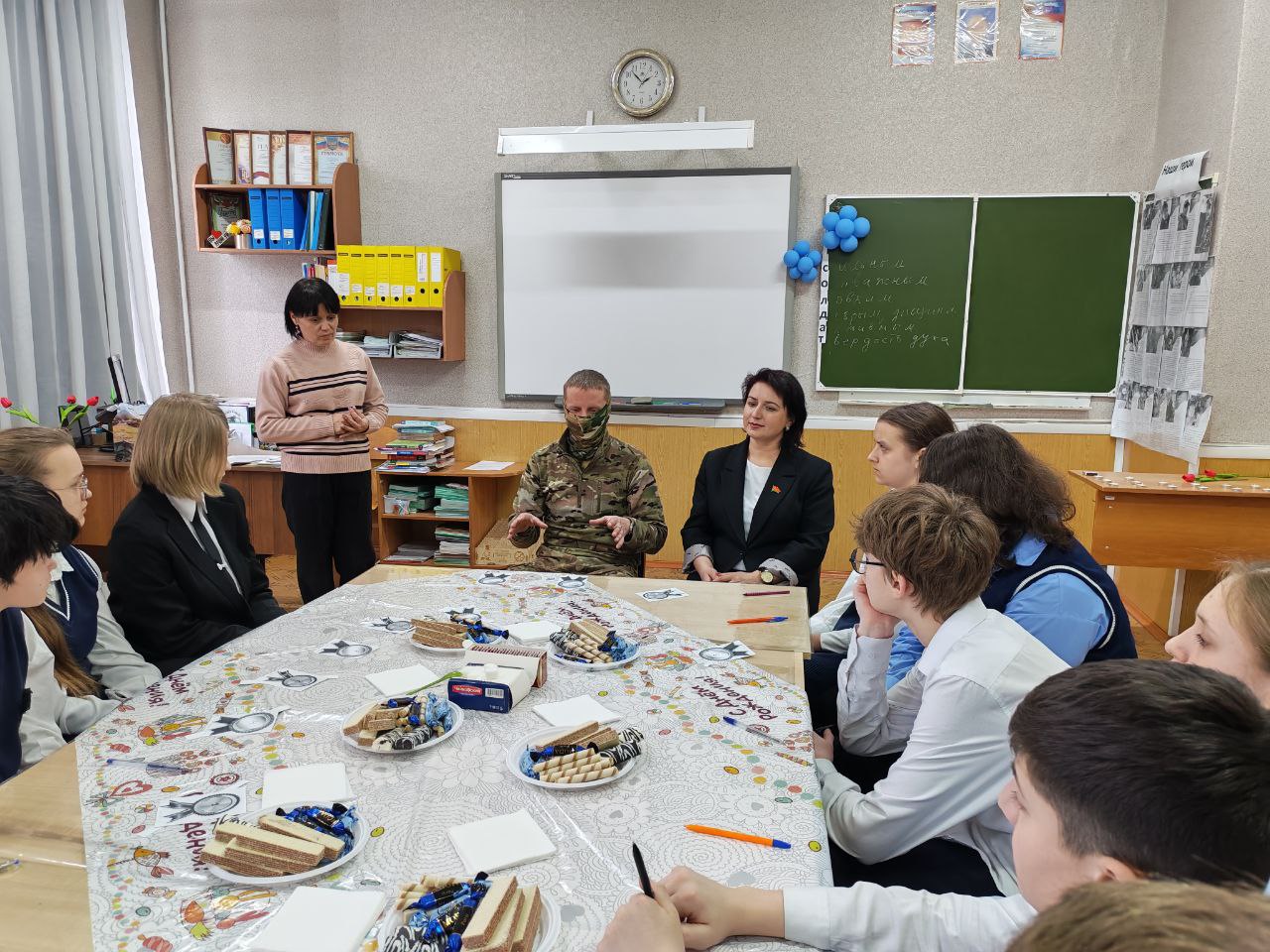 Депутат фракции «Единая Россия» в Гуковской городской Думе и руководитель волонтерского движения «Наша Победа» Ирина Горенко организовала для ребят школы №22 невероятно трогательную встречу в формате дружеской беседы с действующим участником СВО Игорем.