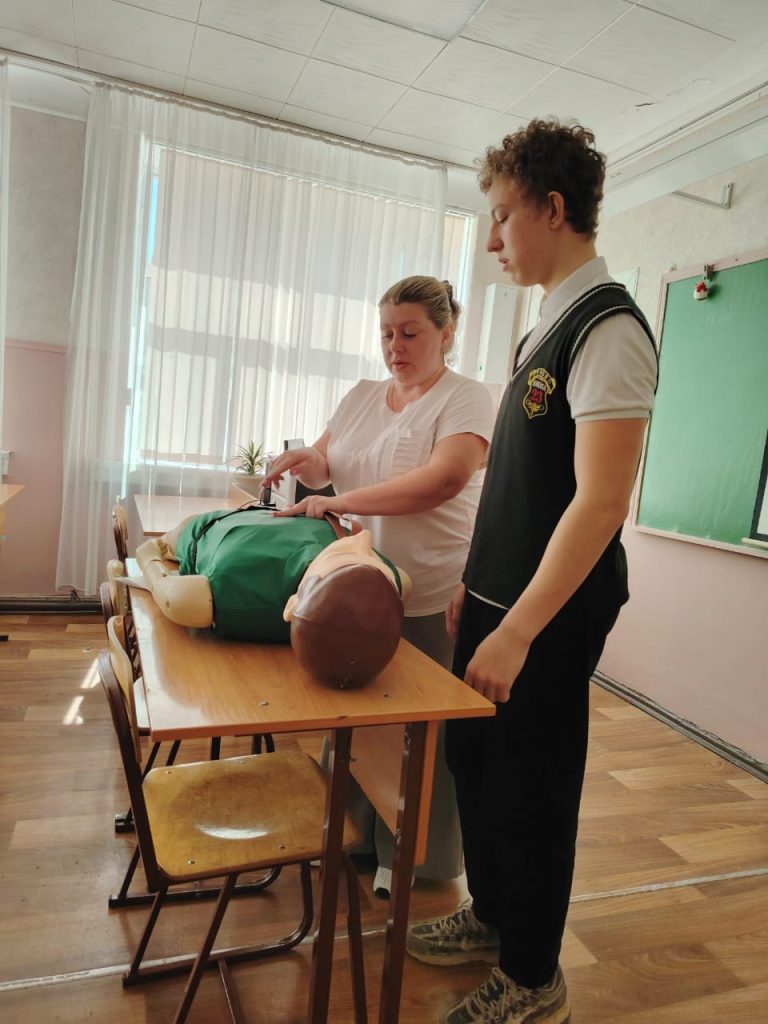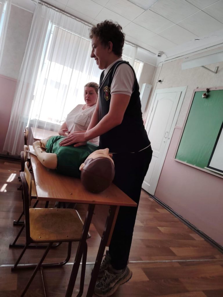 Урок открыла председатель местного отделения Елена Юрьевна Доброходская. Она рассказала ребятам о правилах оказания первой помощи и о том, как правильно вести себя в различных ситуациях, угрожающих жизни и здоровью. Елена Юрьевна провела мастер-класс и продемонстрировала на медицинском манекене, как правильно проводить сердечно-легочную реанимацию. Учащиеся с удовольствием повторили за ней. Разобрали ситуационные задачи.