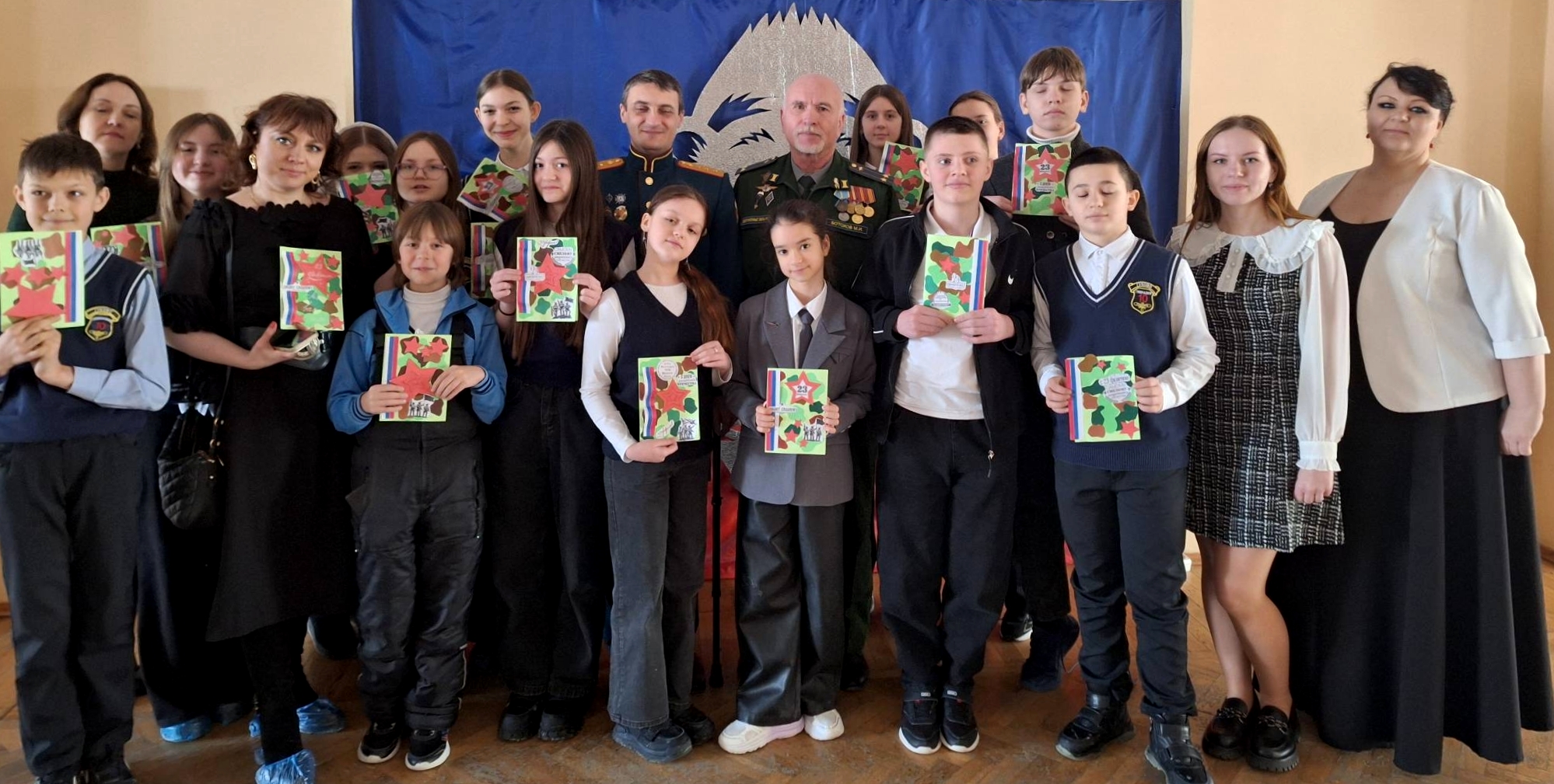 Руководитель студии творчества «Феерия» Анна Николаевна Паюк показала ребятам технику изготовления поздравительной открытки «С Днем защитника Отечества». Школьники во время изготовления открыток с большим интересом задавали вопросы военнослужащим, а они в свою очередь отвечали, где они учились, служили, страшно ли им было при выполнении боевых задач. Михаил Иванович и Василий Николаевич дали ребятам наставление, чтобы они любили свою Родину, семью, уважали старших. Участники мастер-класса вместе с военнослужащими изготовили трогательную весточку бойцам СВО, с наилучшими пожеланиями и поздравлениями, со словами поддержки и благодарности.