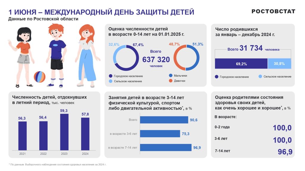 По данным последних исследований на 1 января 2025 года численность детей в возрасте от 0 до 14 лет составляет 637 320 человек, среди которых преобладают мальчики — их доля достигает 51,3%.