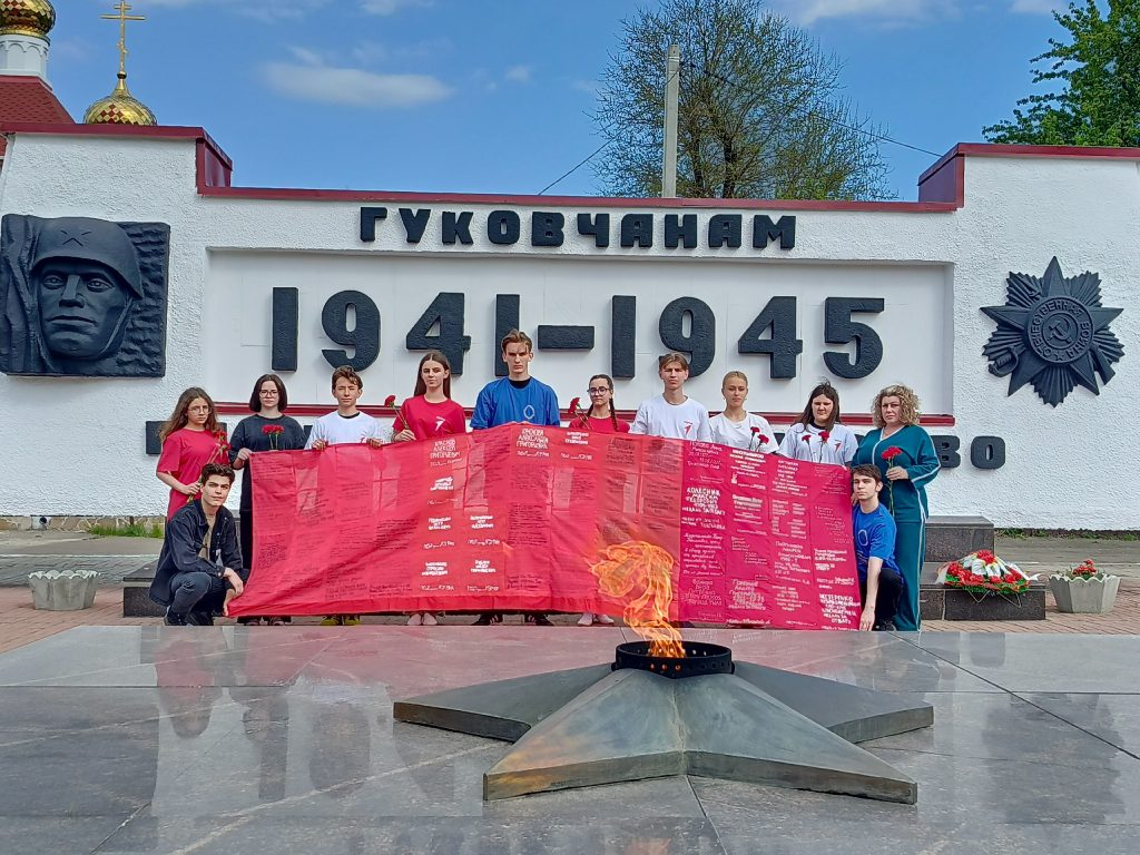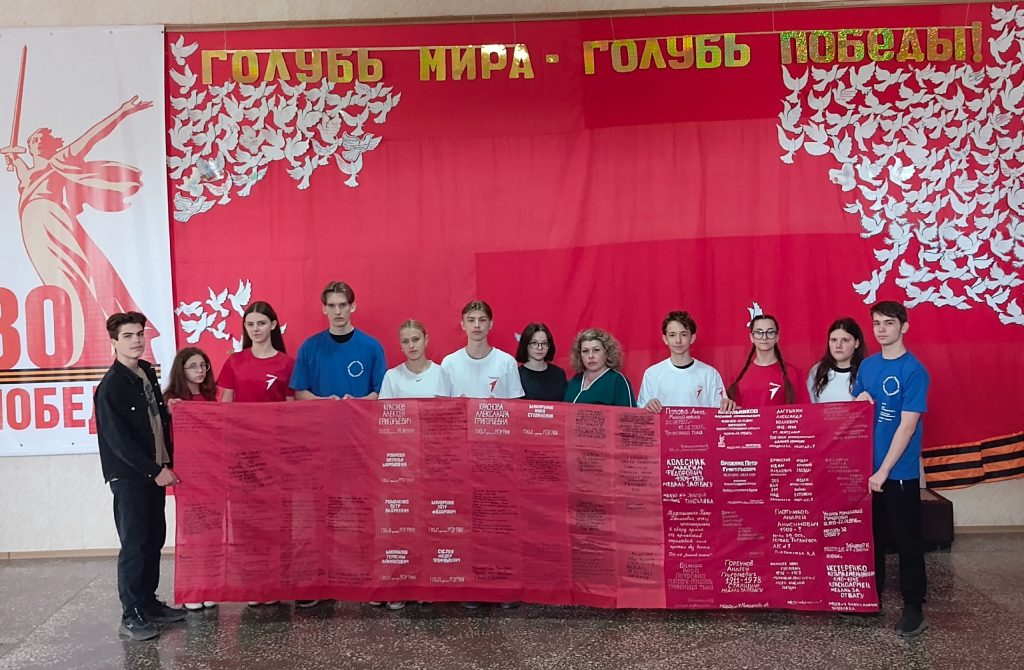 К акции присоединились и гуковские активисты «Движения Первых» Дома детского творчества. Ребята взялись за создание полотна совместно с председателем местного отделения Еленой Юрьевной Доброходской и аккуратно вывели имена своих прадедов на алой ткани.